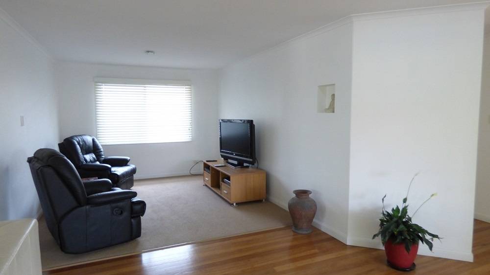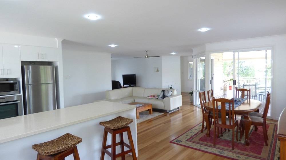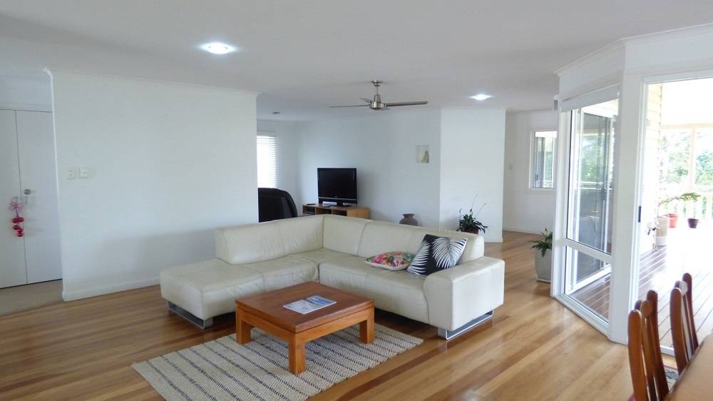 *  Central open plan living and dining areas, which flow on to deck, have beautiful solid timber floors.