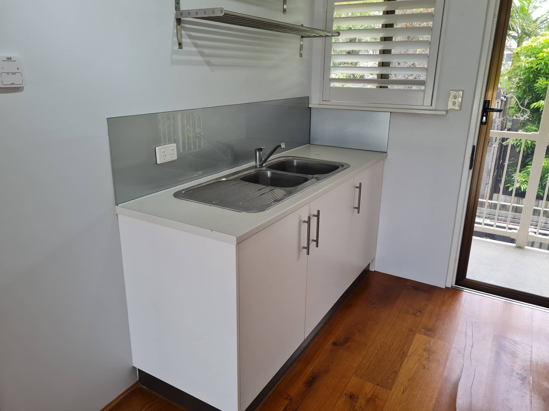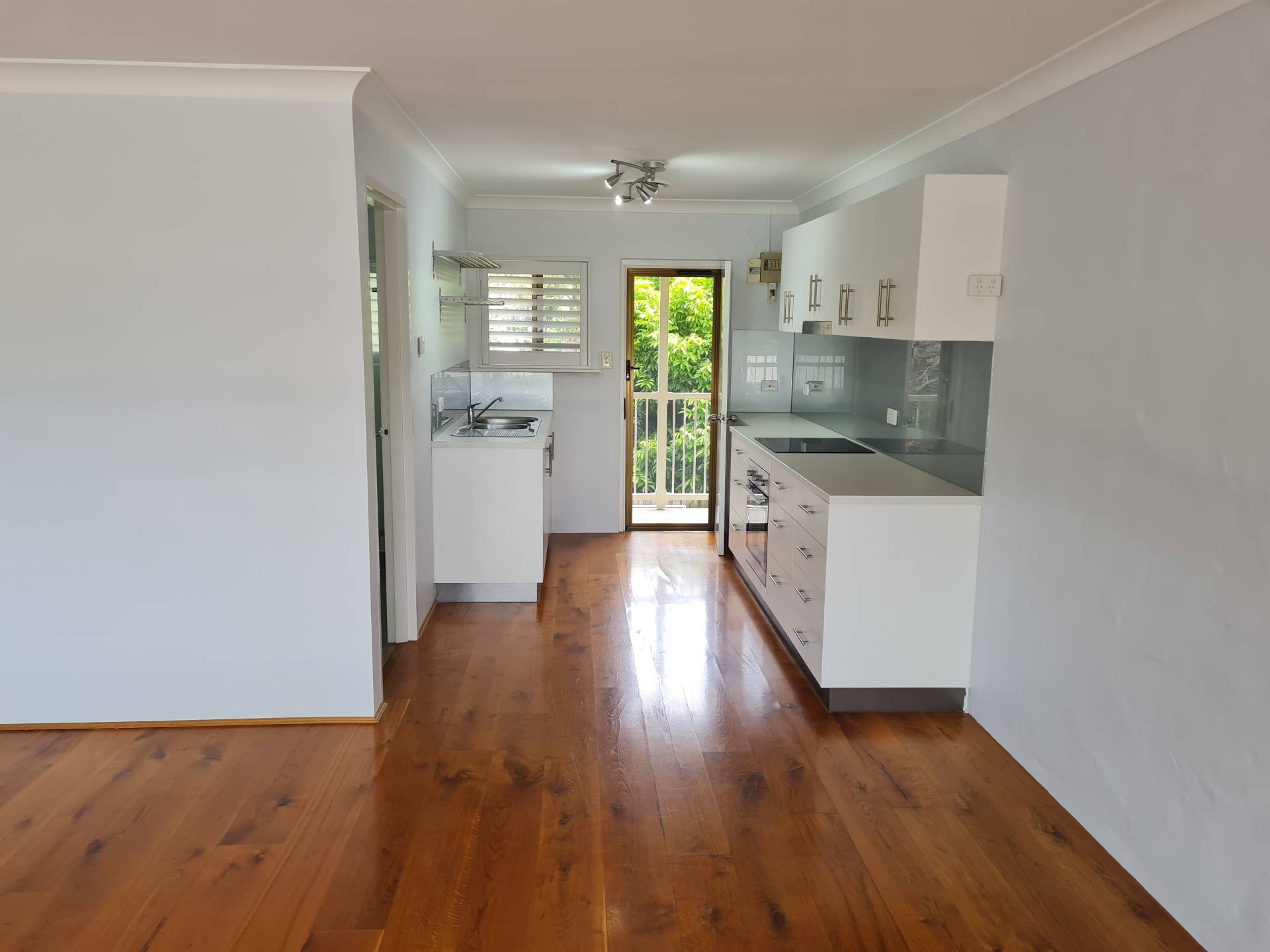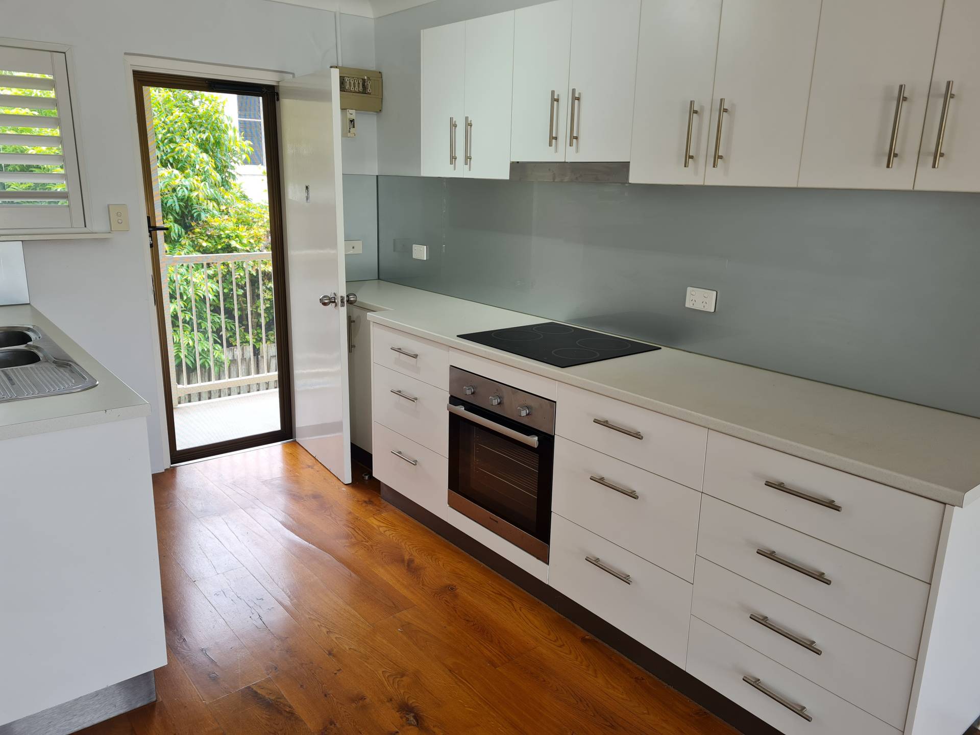 Under bench oven, glass hotplates (4), rangehood, no dishwasher.