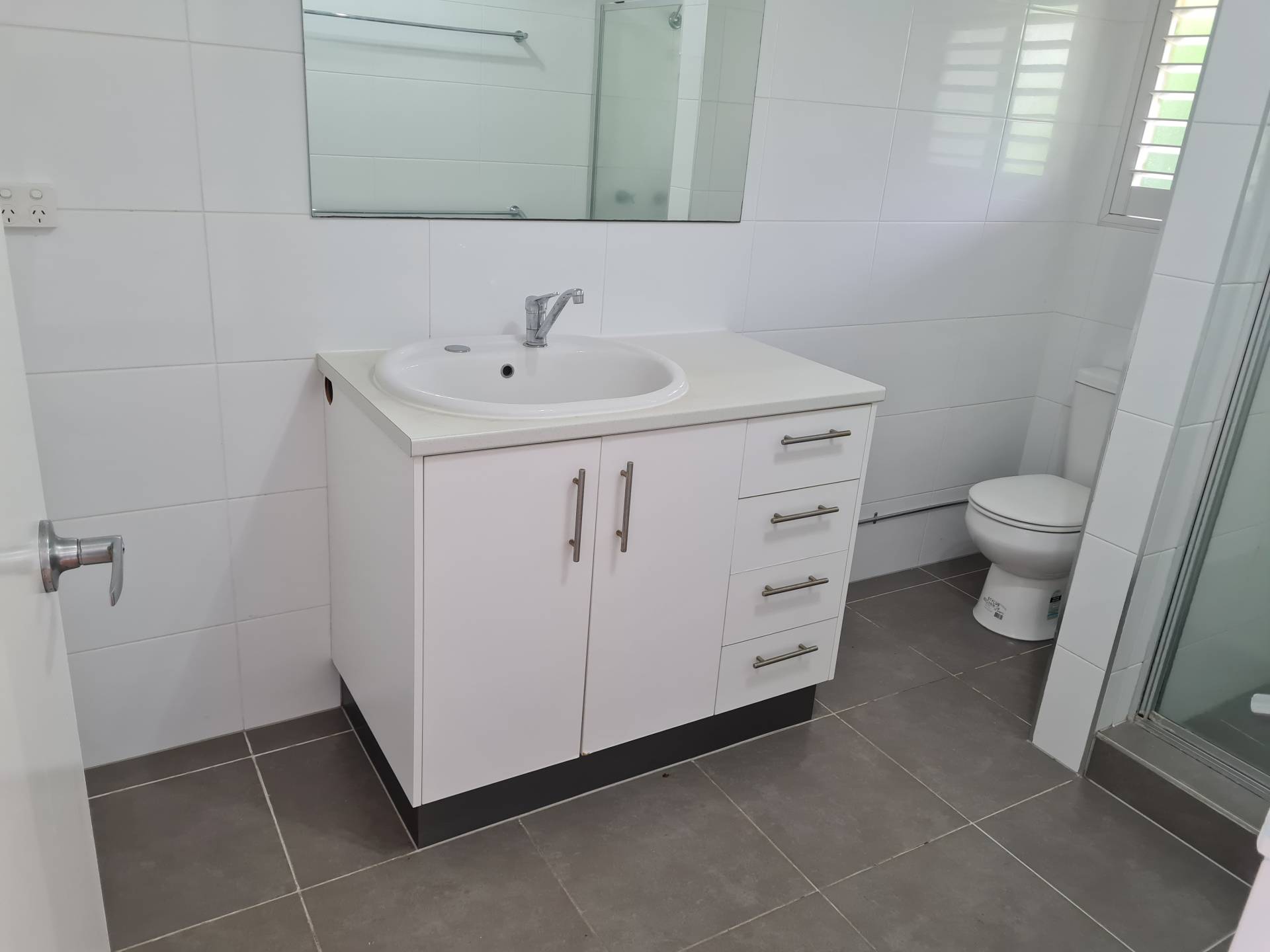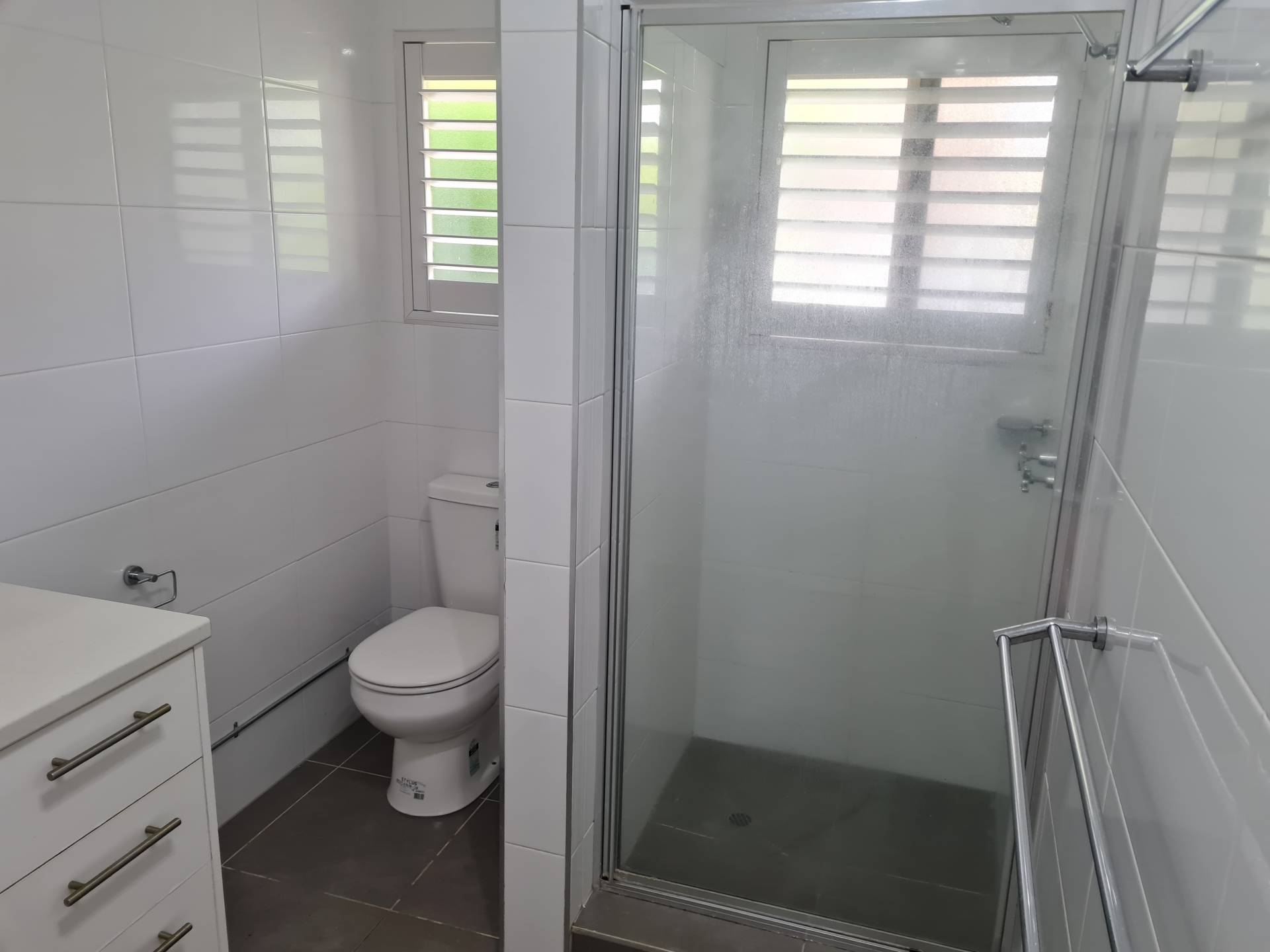 One bathroom with shower recess, vanity, toilet and taps for the washing machine.
