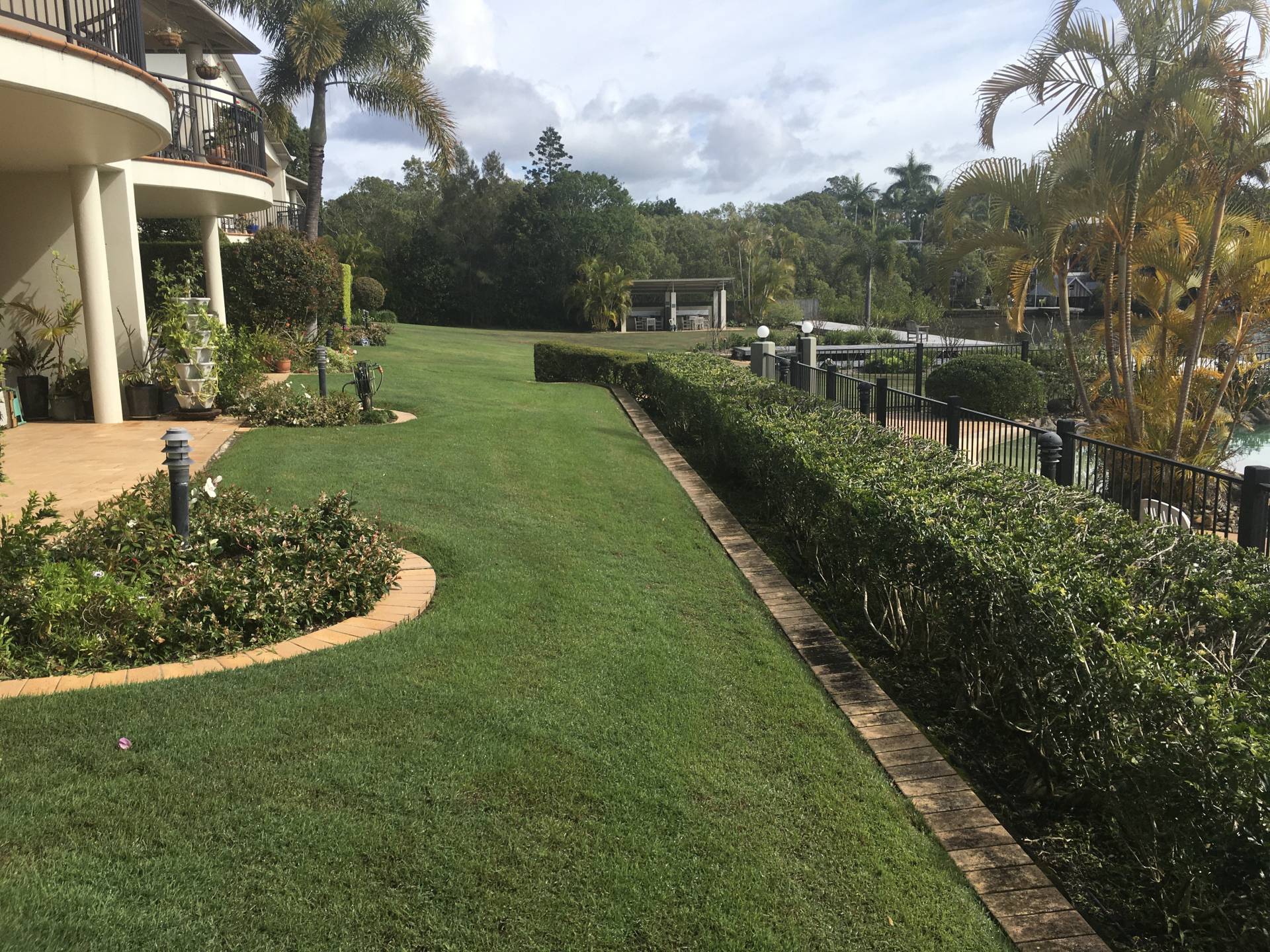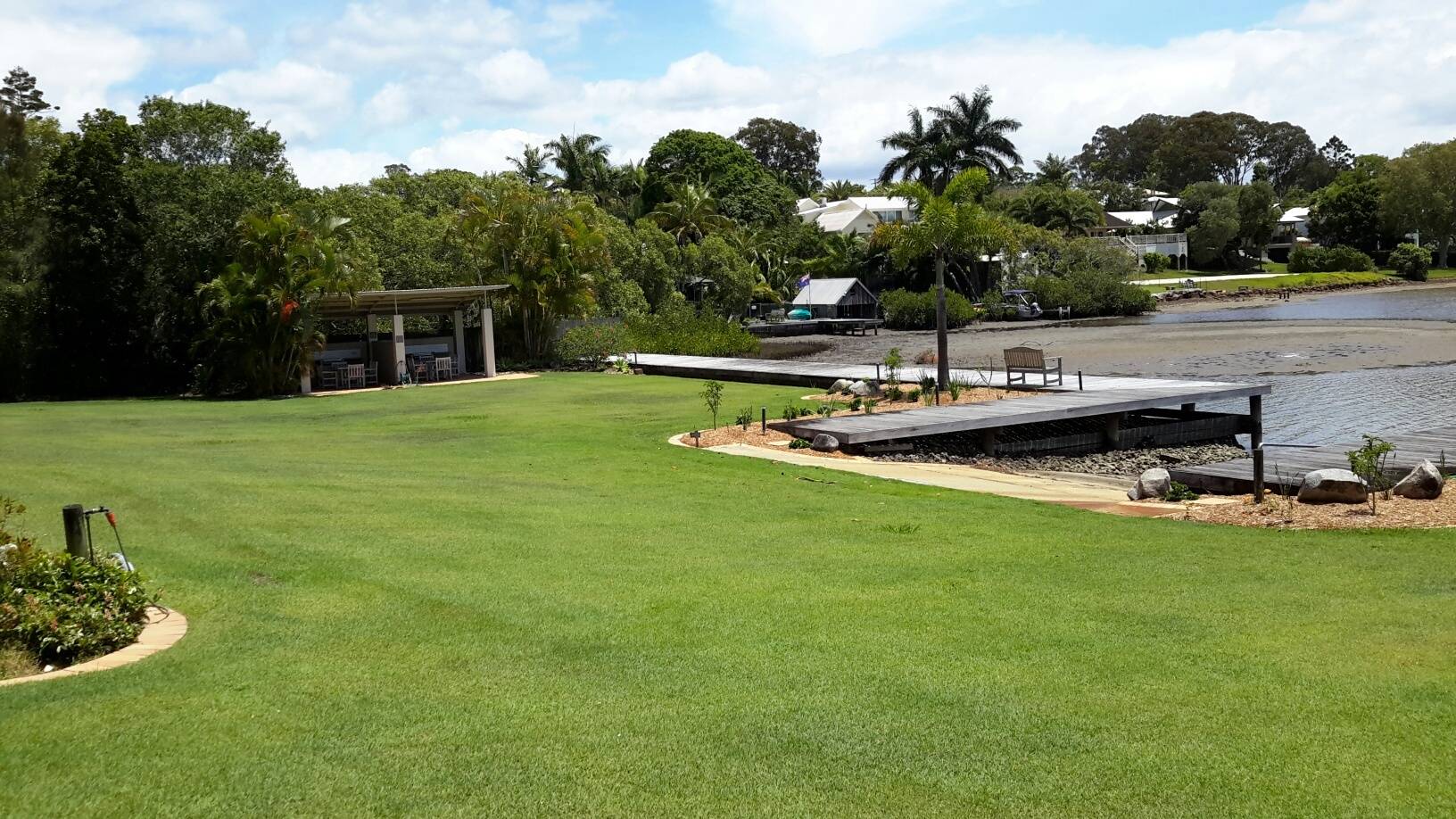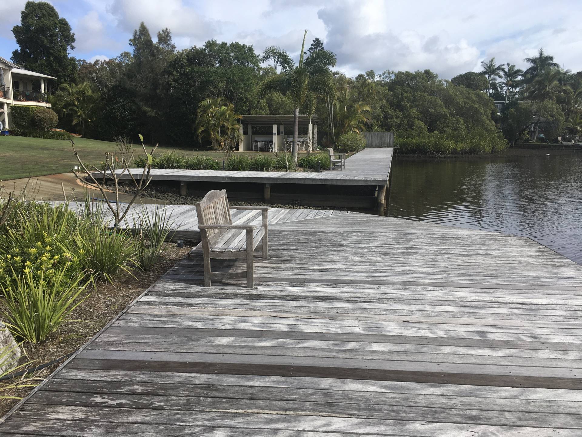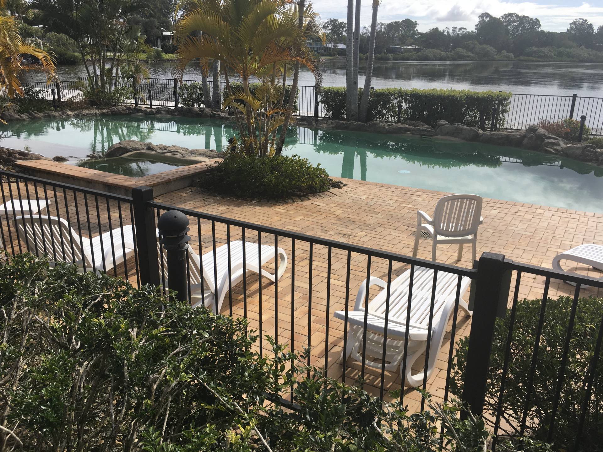 There is a magnificent paved sitting area, undercover, just outside the front glass doors, that overlooks the water. Also, outside the front of this unit is a  huge grass & garden area, fully maintained by the Body Corporate that features and fantastic in ground pool, a jetty/water side deck and also an undercover BBQ area for resident use only.